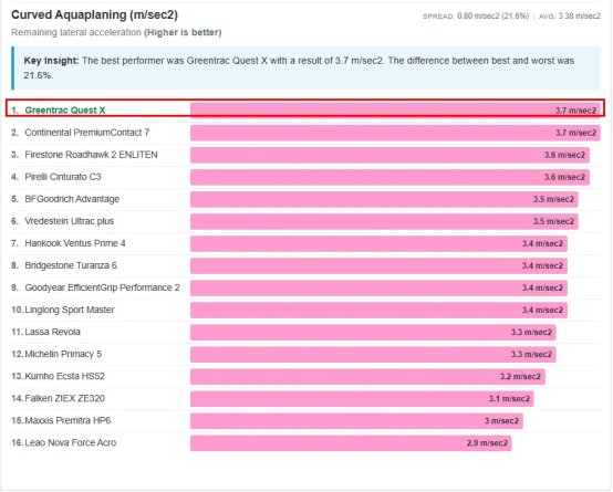 Wet roads are the greatest hazard during rainy driving, and ADAC assigns a 60% weight to wet performance. In the Lateral Aquaplaning test, Quest-X achieved 3.7 m/s², ranking joint first (tied with Continental PremiumContact 7). This test simulates lane changes or cornering on wet roads and evaluates lateral grip. Quest-X’s high lateral acceleration ensures rapid water drainage, preventing hydroplaning and providing a higher safety margin on water-covered roads. For drivers concerned about rain-slicked surfaces or living in regions with frequent rain, driving with Quest-X turns worry into confidence.