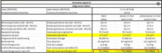 Noise is the invisible killer during long-distance driving. In the ADAC test, noise and fuel consumption are the most perceptible metrics to users, carrying the highest weighting. Official results show that Quest-X ranks joint first in both pass-by noise (70.2 dB(A)) and interior noise (1.5 points), with a composite noise score of 2.1 (“gut”/excellent). This demonstrates that Quest-X offers a noise experience on par with top-tier premium tires.
